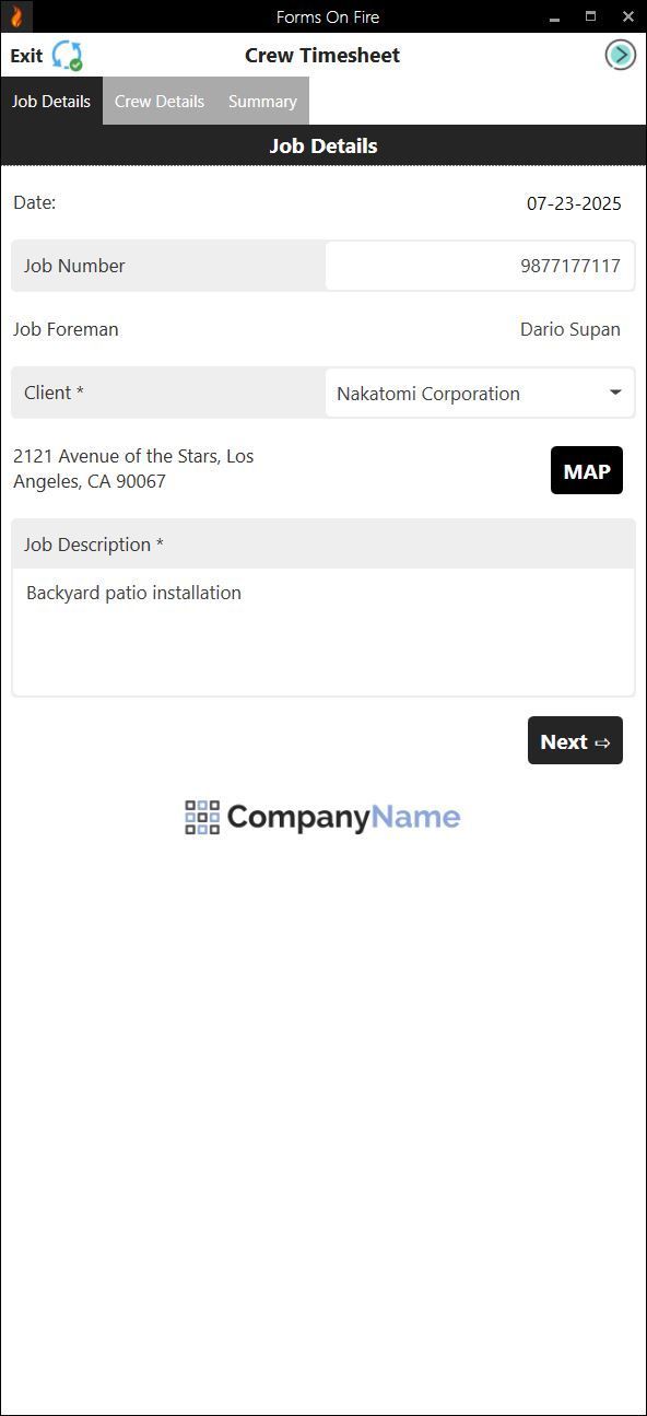 Here is an example of a crew timesheet template built using Forms On Fire by one of our clients in the landscaping industry.